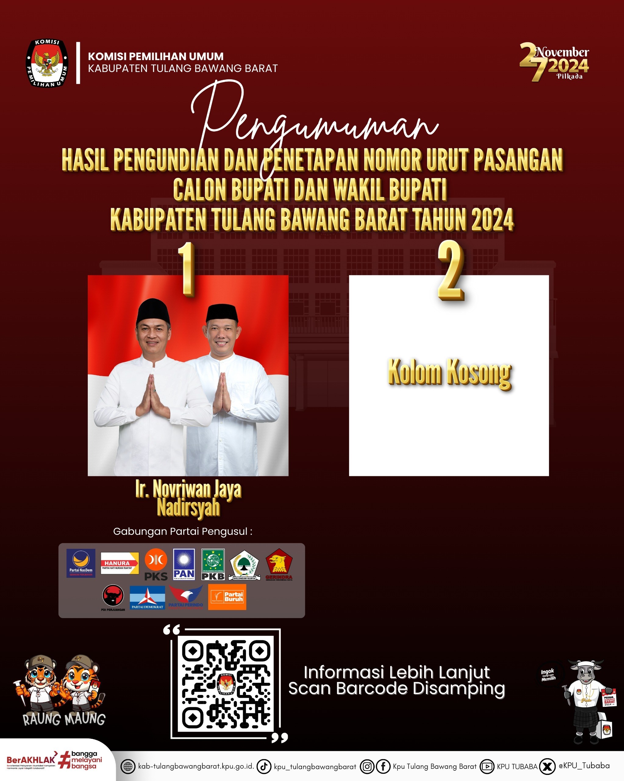 KOMISI PEMILIHAN UMUM KABUPATEN TULANG BAWANG BARAT PENGUMUMAN NOMOR : 226/PL. 02.5-Pu/1812/2024 TENTANG HASIL PENERIMAAN LAPORAN PENERIMAAN SUMBANGAN DANA KAMPANYE PEMILIHAN BUPATI DAN WAKIL BUPATI KABUPATEN TULANG BAWANG BARAT TAHUN 2024 Berdasarkan Tanda Terima dan Berita Acara Penerimaan LPSDK Pasangan Calon Bupati dan Wakil Bupati Kabupaten Tulang Bawang Barat Tahun 2024 di KPU Kabupaten Tulang Bawang Barat, disampaikan hasil penerimaan LPSDK sebagai berikut: NO PASANGAN CALON WAKTU PENYAMPAIAN SUMBANGAN DANA KAMPANYE PRIBADI CALON PARPOL/ GABUNGAN PARPOL PERSEORANGAN BADAN HUKUM SWASTA TOTAL 1. Ir.NOVRIWAN JAYA,S.P. - NADIRSYAH Kamis, 24-10- 2024 14:42 WIB 600.000.000,- - 495.000.000,- - 1.095.000.000,- Pengumuman Selengkapnya Dapat Di Unduh di : PENGUMUMAN HASIL PENERIMAAN LPSDK PBDWB TBB TAHUN 2024