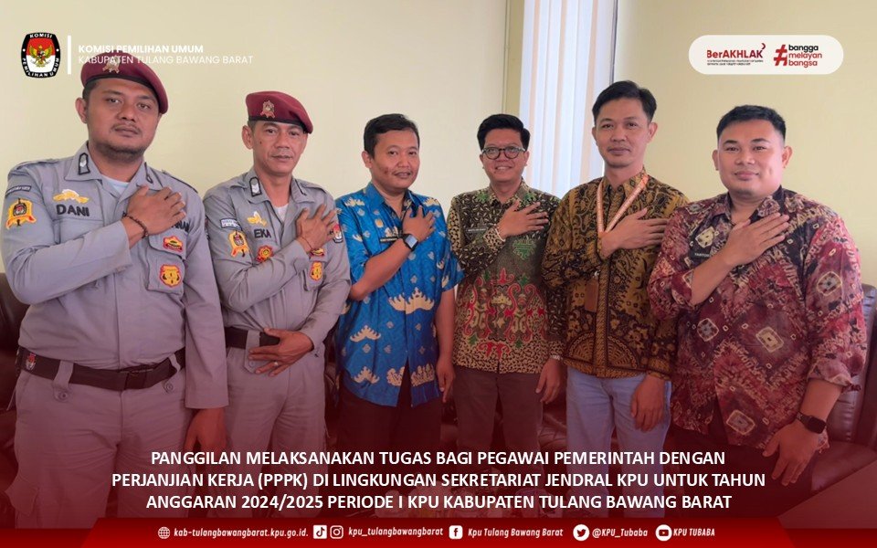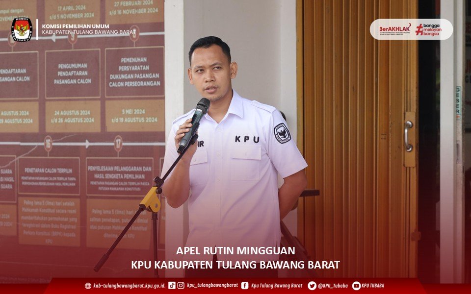 KPU Kabupaten Tulang Bawang Barat melaksanakan Apel Rutin Mingguan di halaman Kantor KPU Kabupaten Tulang Bawang Barat, Hadir sebagai Pembina Apel Anggota KPU Ahmad Haidir Ali. S.E., dan diikuti oleh Anggota KPU Fahmi Firmansyah, S. Pd., Sukirman Hadi, S.H., M.H., Plt. Sekretaris Wahyu Ari Bowo, S.H., seluruh Kasubbag, Staf ASN, serta PPNPN KPU Kabupaten Tulang Bawang Barat, Senin,(05/05/2025).