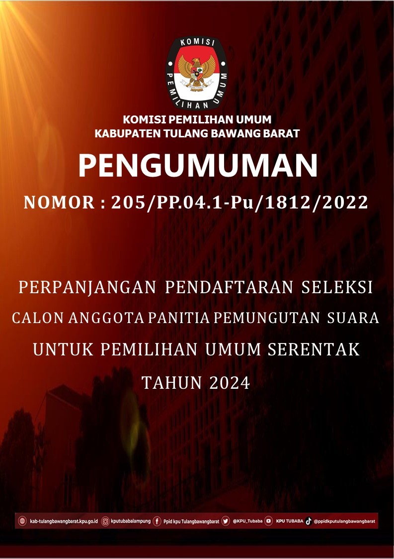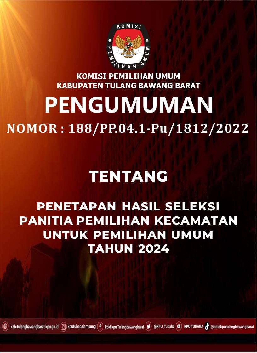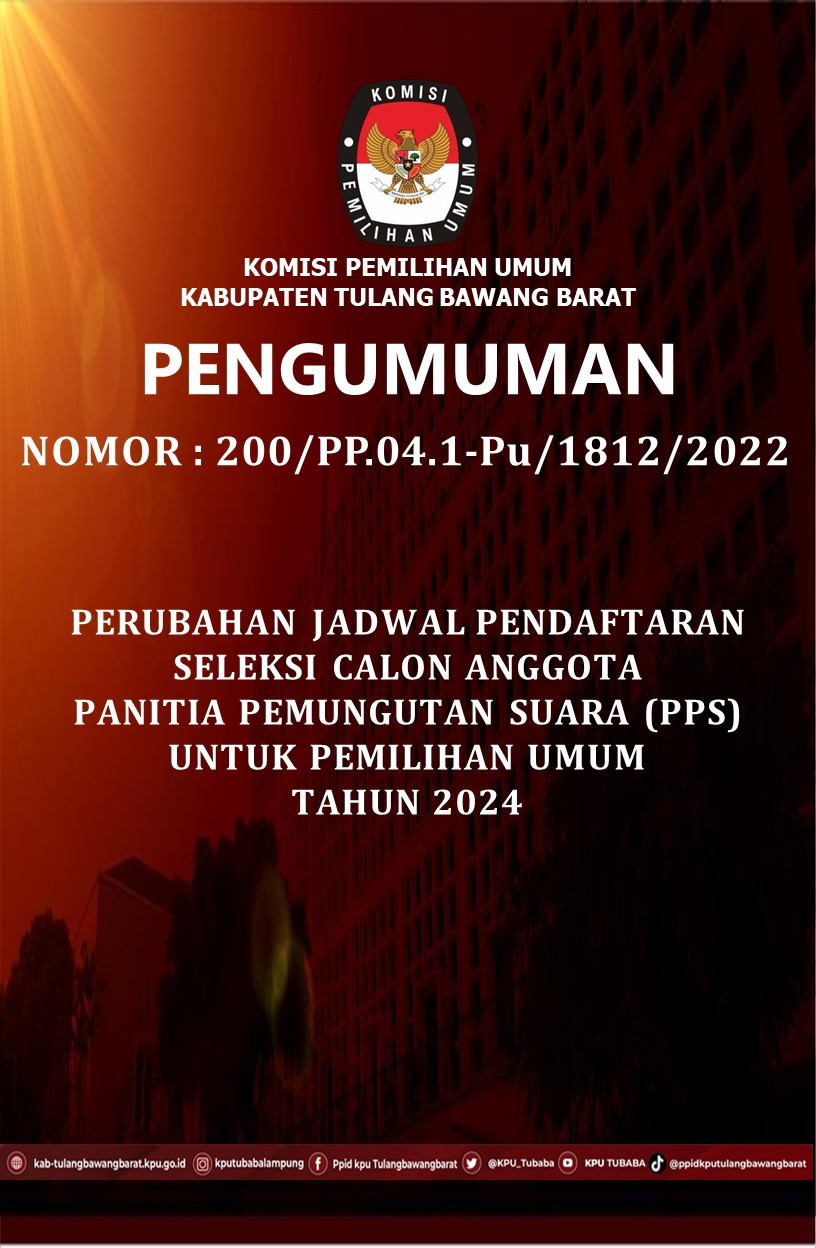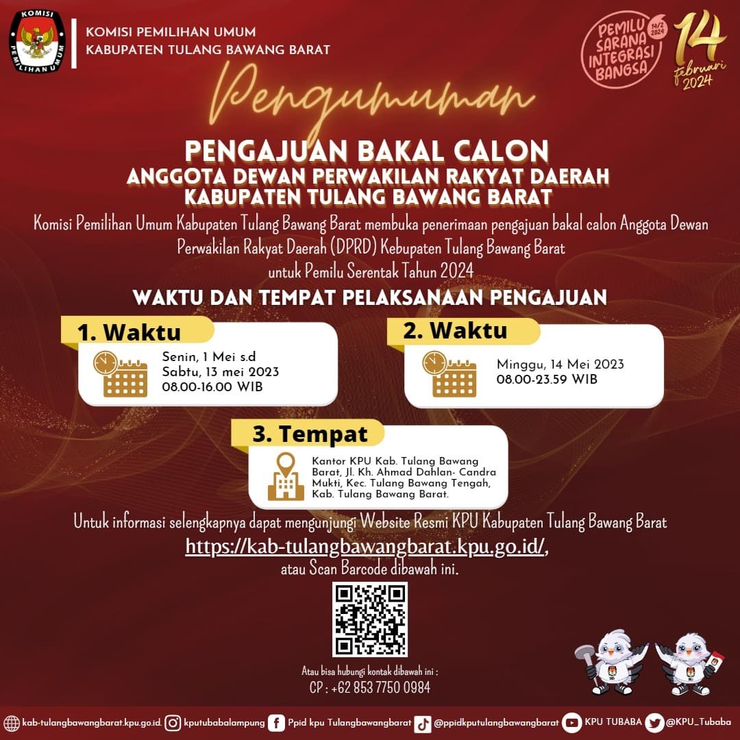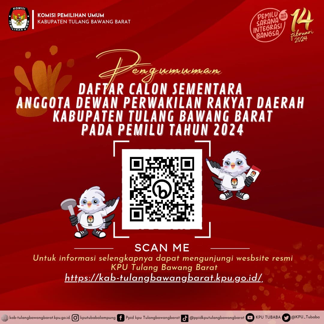 PENGUMUMAN NOMOR : 85/PL.01.1-PU/1812/2023 TENTANG PENGAJUAN BAKAL CALON ANGGOTA DEWAN PERWAKILAN RAKYAT DAERAH KABUPATEN TULANG BAWANG BARAT UNTUK PEMILU SERENTAK TAHUN 2024 Komisi Pemilihan Umum Kabupaten Tulang Bawang Barat membuka penerimaan pengajuan bakal calon Anggota Dewan Perwakilan Rakyat Daerah (DPRD) Kabupaten Tulang Bawang Barat untuk Pemilu Serentak Tahun 2024 melalui Partai Politik Peserta Pemilu pada kepengurusan Kabupaten dengan ketentuan sebagai berikut: DOKUMEN PENGAJUAN Surat Pengajuan menggunakan formulir MODEL B-PENGAJUAN-PARPOL dalam bentuk fisik disampaikan langsung dan digital yang diunggah di Silon; Daftar Bakal Calon menggunakan formulir MODEL B-DAFTAR.BAKAL.CALON disertai foto diri terbaru bakal calon dan dilampiri dengan dokumen pengajuan bakal calon yang ditandatangani oleh Ketua Umum Partai Politik Peserta Pemilu atau nama lain dan Sekretaris Jenderal Partai Politik Peserta Pemilu atau nama lain yang sah sesuai dengan Keputusan Menteri yang menyelenggarakan urusan pemerintahan di bidang hukum dan hak asasi manusia tentang pengesahan susunan pengurus partai politik tingkat pusat dalam bentuk fisik disampaikan langsung dan digital yang diunggah di Silon; dan Dokumen persyaratan administrasi Bakal Calon sebagaimana dimaksud dalam Pasal 12 sampai dengan Pasal 23 Peraturan KPU yang mengatur tentang Pencalonan Anggota DPR, DPRD Provinsi dan DPRD Kabupaten/Kota dalam bentuk digital diunggah di Silon. download pengumuman di : https://bit.ly/PPCADPRDTBB Ikuti Berita Terbaru KPU Kabupaten Tulang Bawang Barat dengan follow dan like akun Media sosial Resmi KPU Kabupaten Tulang Bawang Barat : Website : https://kab-tulangbawangbarat.kpu.go.id/ Instagram : https://www.instagram.com/kputubabalampung/ Facebook : https://www.facebook.com/ppid.kputubabarat/ Tiktok : tiktok.com/@ppidkputulangbawangbarat YouTube : https://www.youtube.com/channel/UC6UgBAe7cT0PMn0kceyX2Mg Twiter : https://twitter.com/KPU_Tubaba